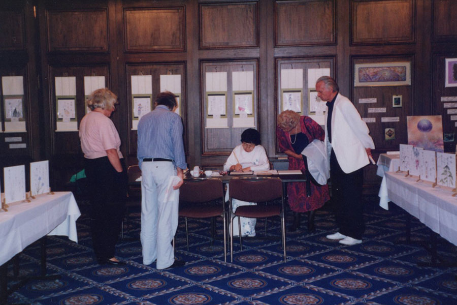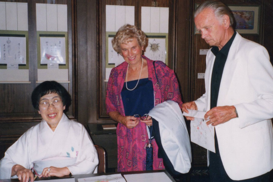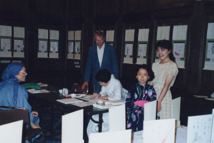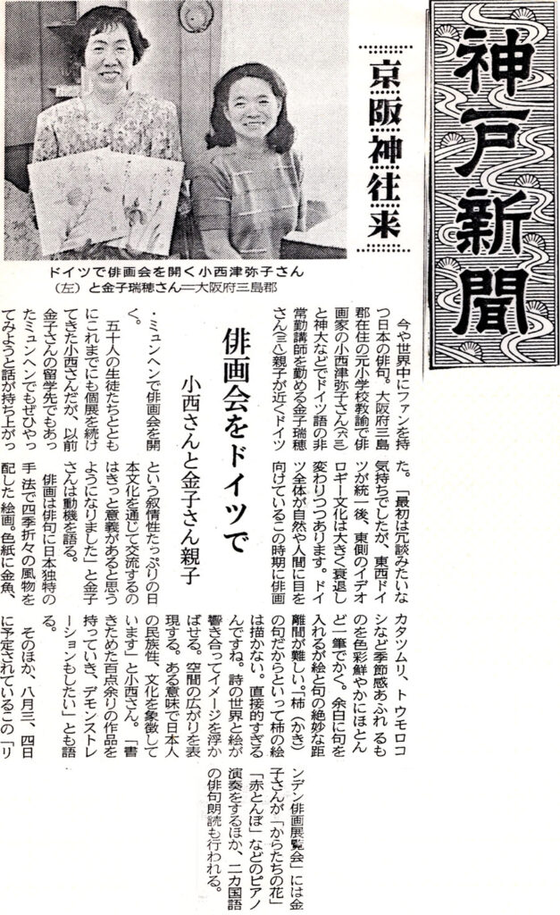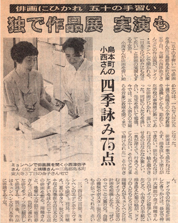 自彊術を習いながら、彼女は俳画も習い始めました。これも50歳の手習いでした。やはり10年頑張ってドイツで個展を開くことができました。俳画は俳句に絵を付けるので、俳句、絵、そして習字が出来なければなりません。これらも習得して、教室を開くことになりました。