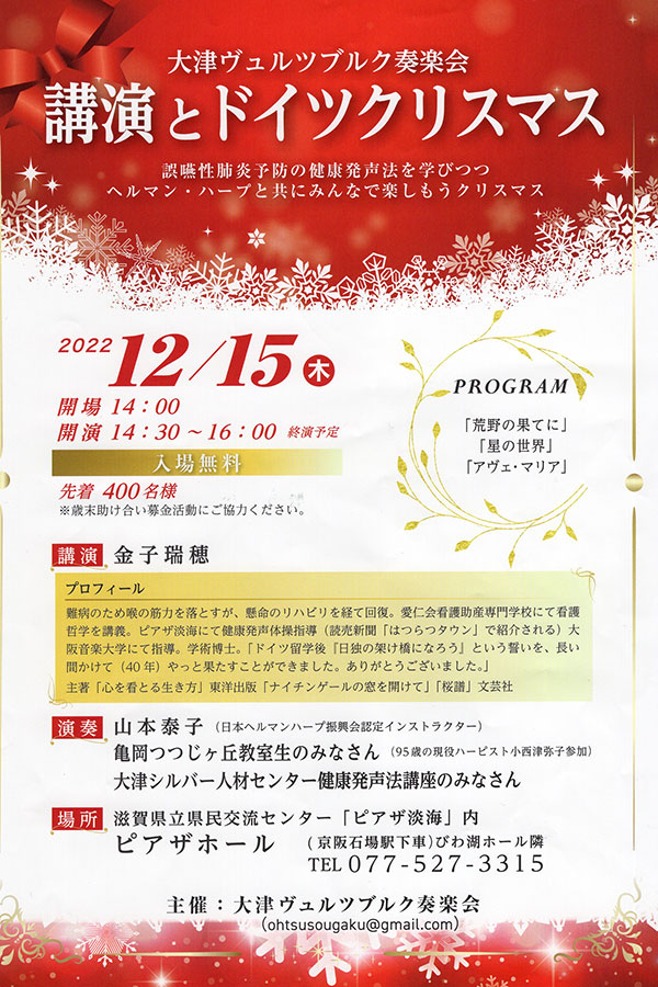 大津ヴュルツブルク奏楽会は、私が大津に越して来て名付けました。それまでは日独抒情詩の会と称していた小さな市民団体です。大津市とヴュルツブルク市が姉妹都市だと知って名付けました。ドイツに留学しました折、皆様に親切にしていただき、その恩返しのつもりで活動しています。私の好きな詩は、リルケの「音楽は立像がもらす吐息か」です。